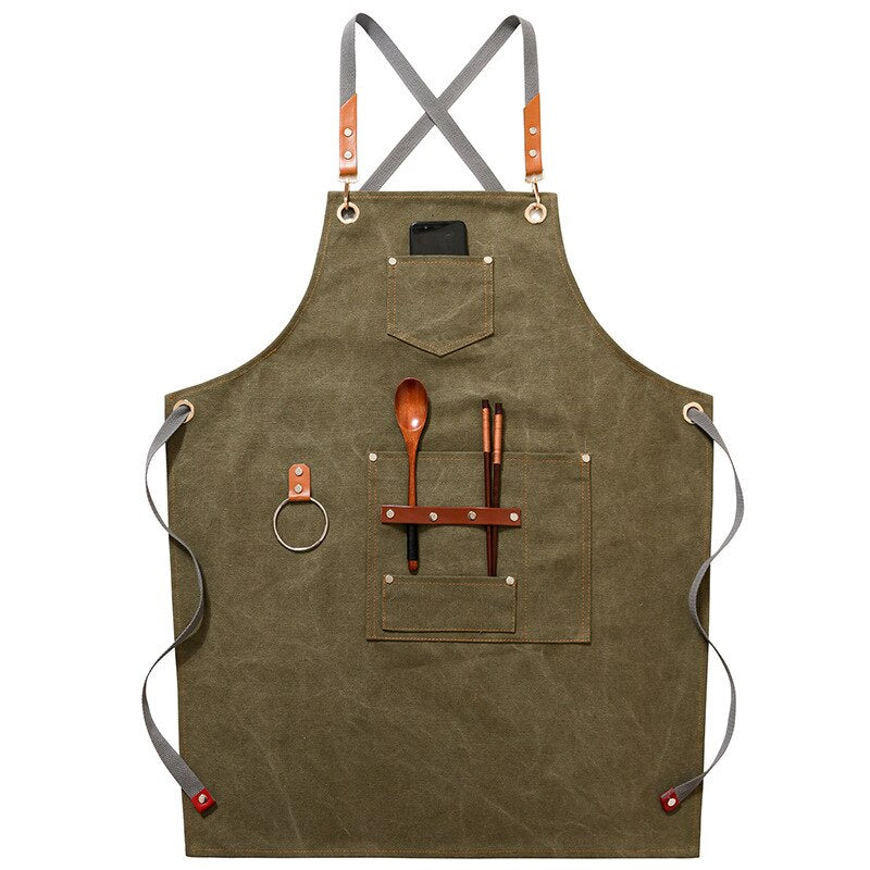 Available in grey, blue, green or brown and finished with large pockets and a metal loop at the front, these contemporary aprons are perfect for storing your utensils and a towel.